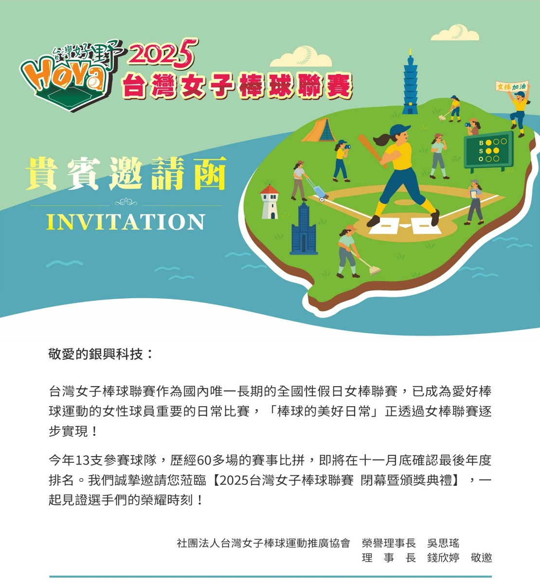銀興科技秉持著「科技扎根、回饋社會」的理念,我們支持台灣女子棒球聯賽,一起為台灣女性棒球運動的發展盡一份心力。
